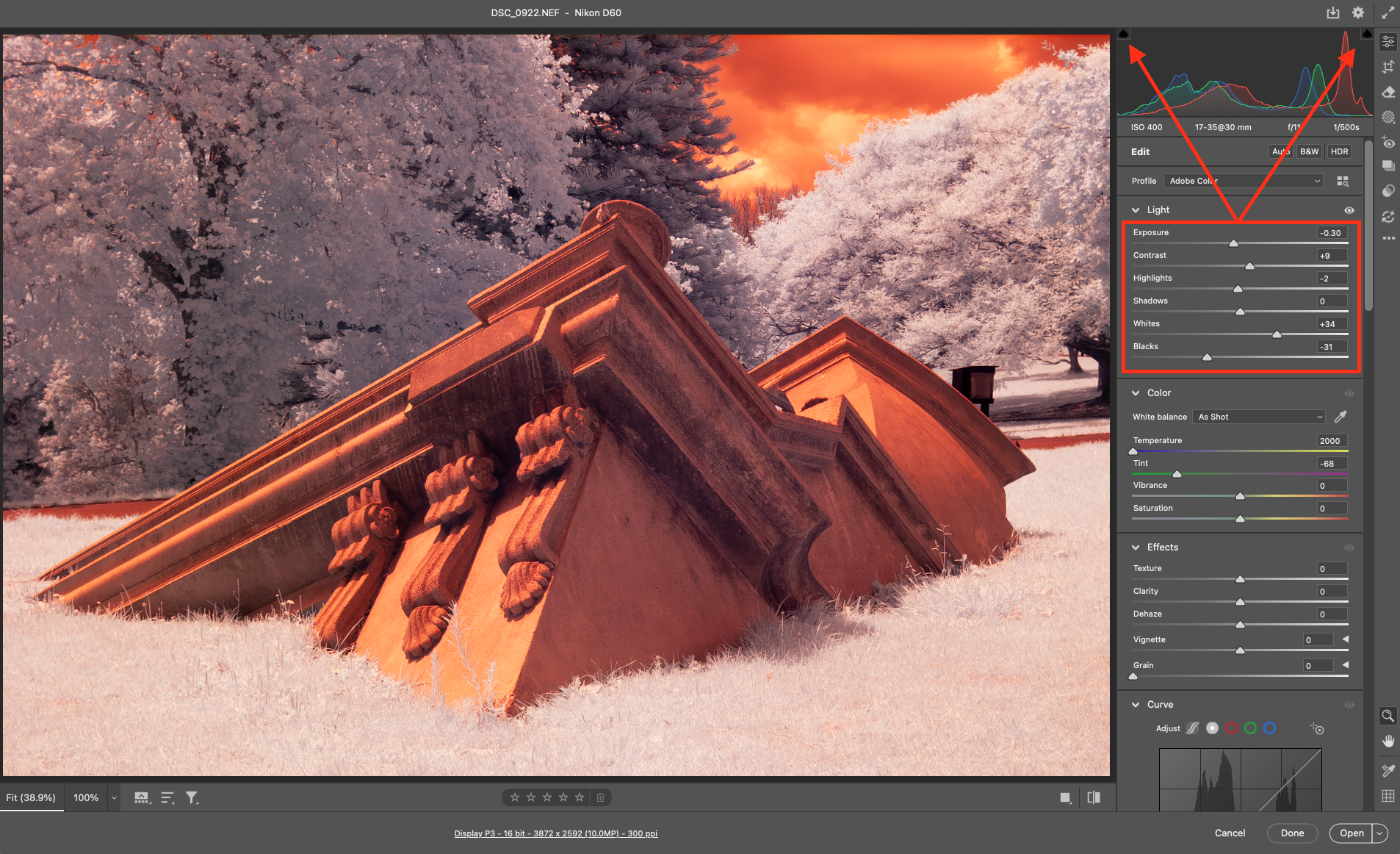 - The RAW file becomes properly centred in the histogram.